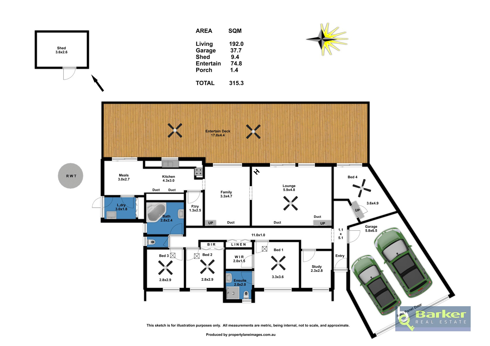 – Sunken lounge with raked ceilings, ceiling fan, combustion heater, and sliding door access to the rear verandah