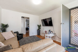 – Lounge room with wooden floorboards and wall mounted air conditioner