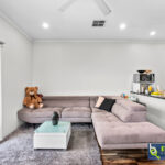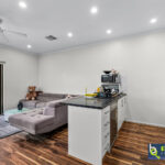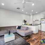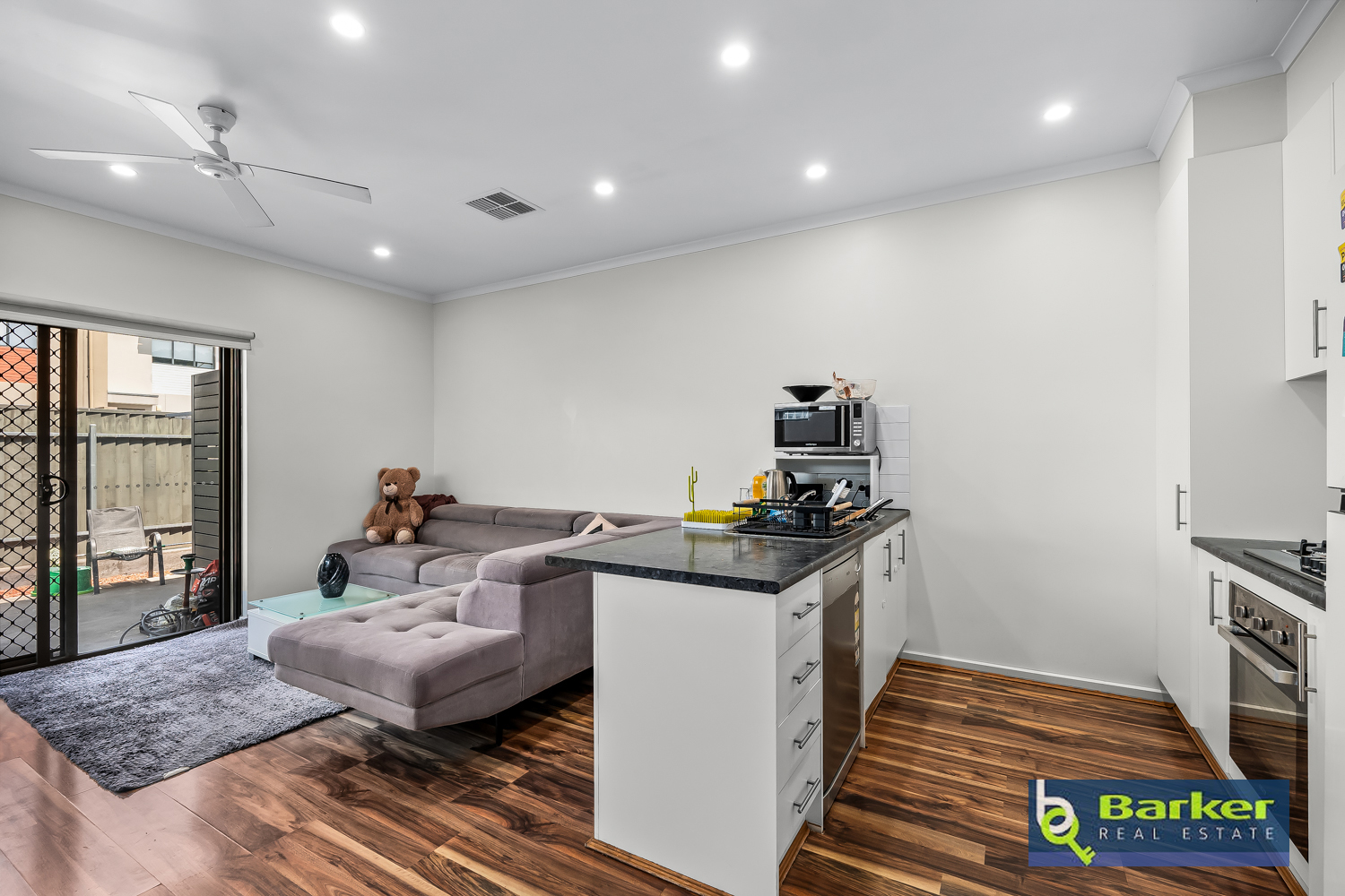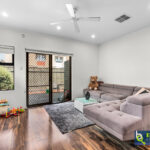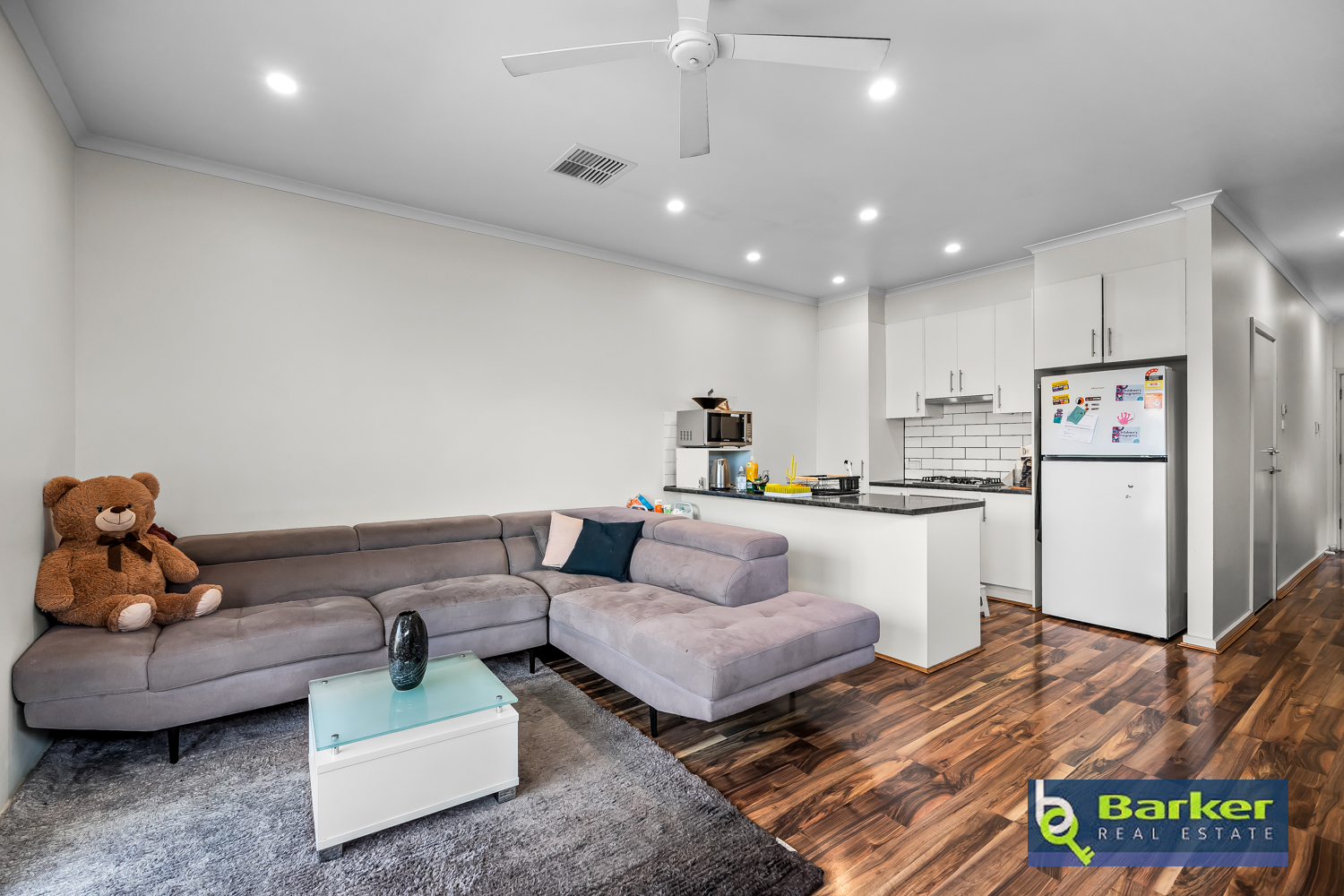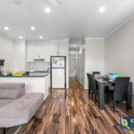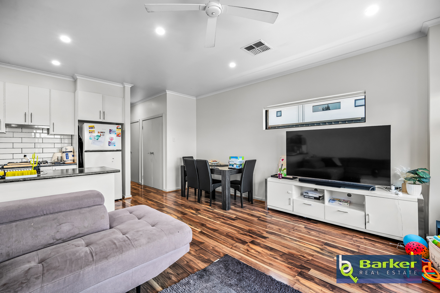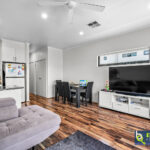 – Open plan style living/dining space fitted with a ceiling fan and wood-look floating floor.