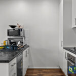 – Modern kitchen with gas cooktop, oven, dishwasher, and large double sink overlooking the living/dining area.