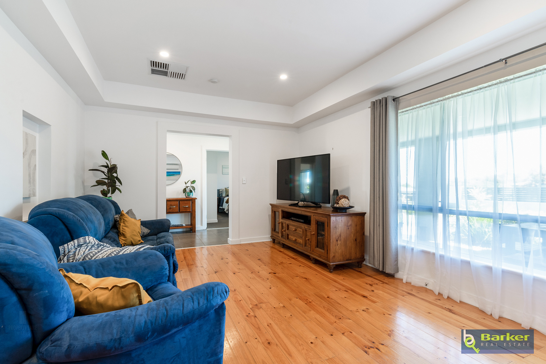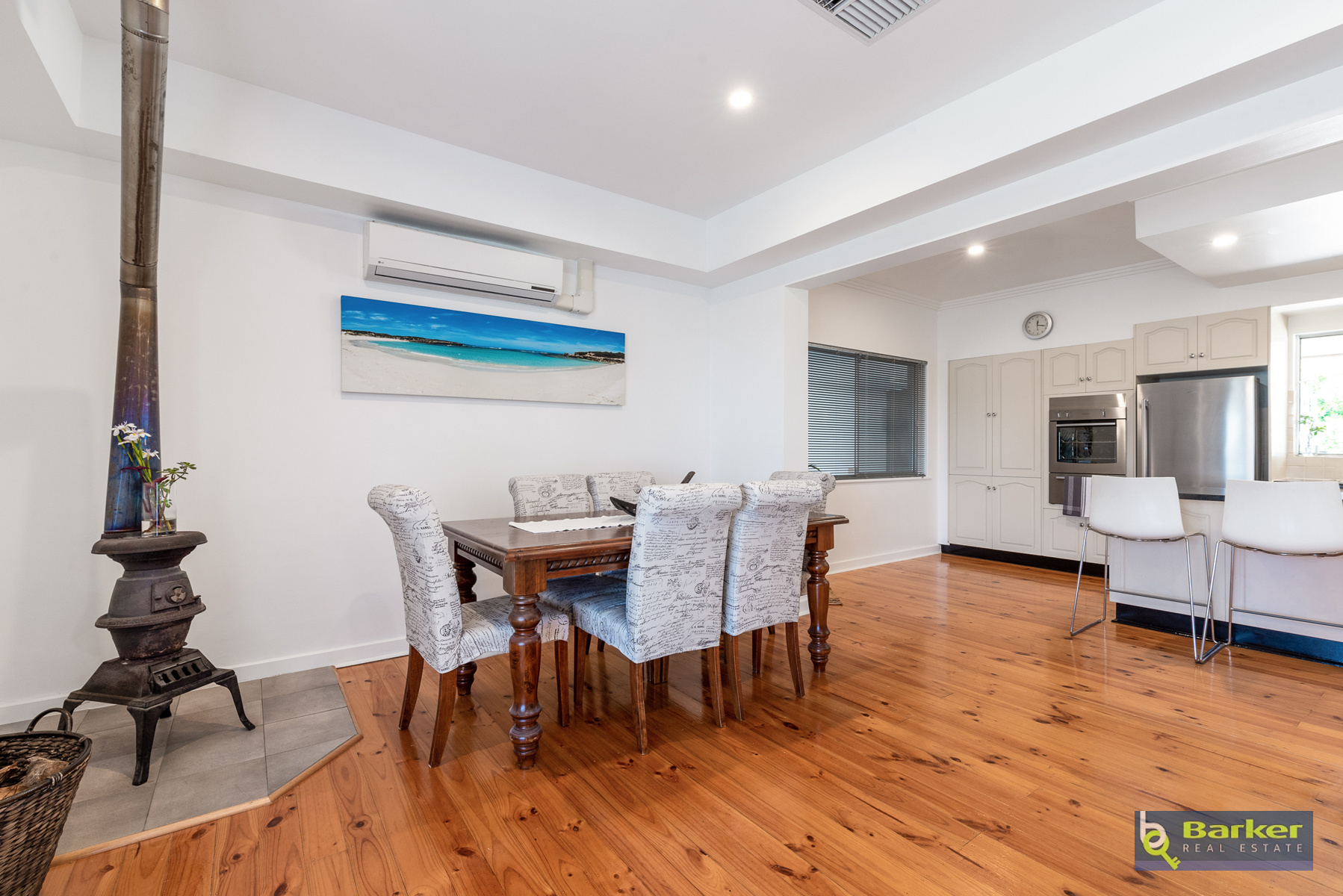 – Lounge room presented with stunning wooden floorboards, combustion heater, split system & vaulted ceilings