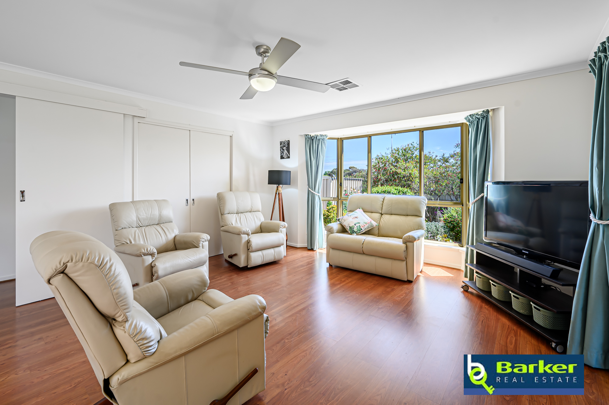 • Open plan family, kitchen, dining space with ceiling fans, floating floors and two bay windows overlooking the yard.