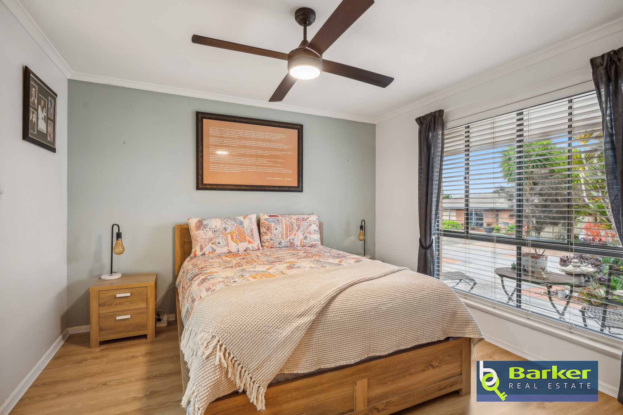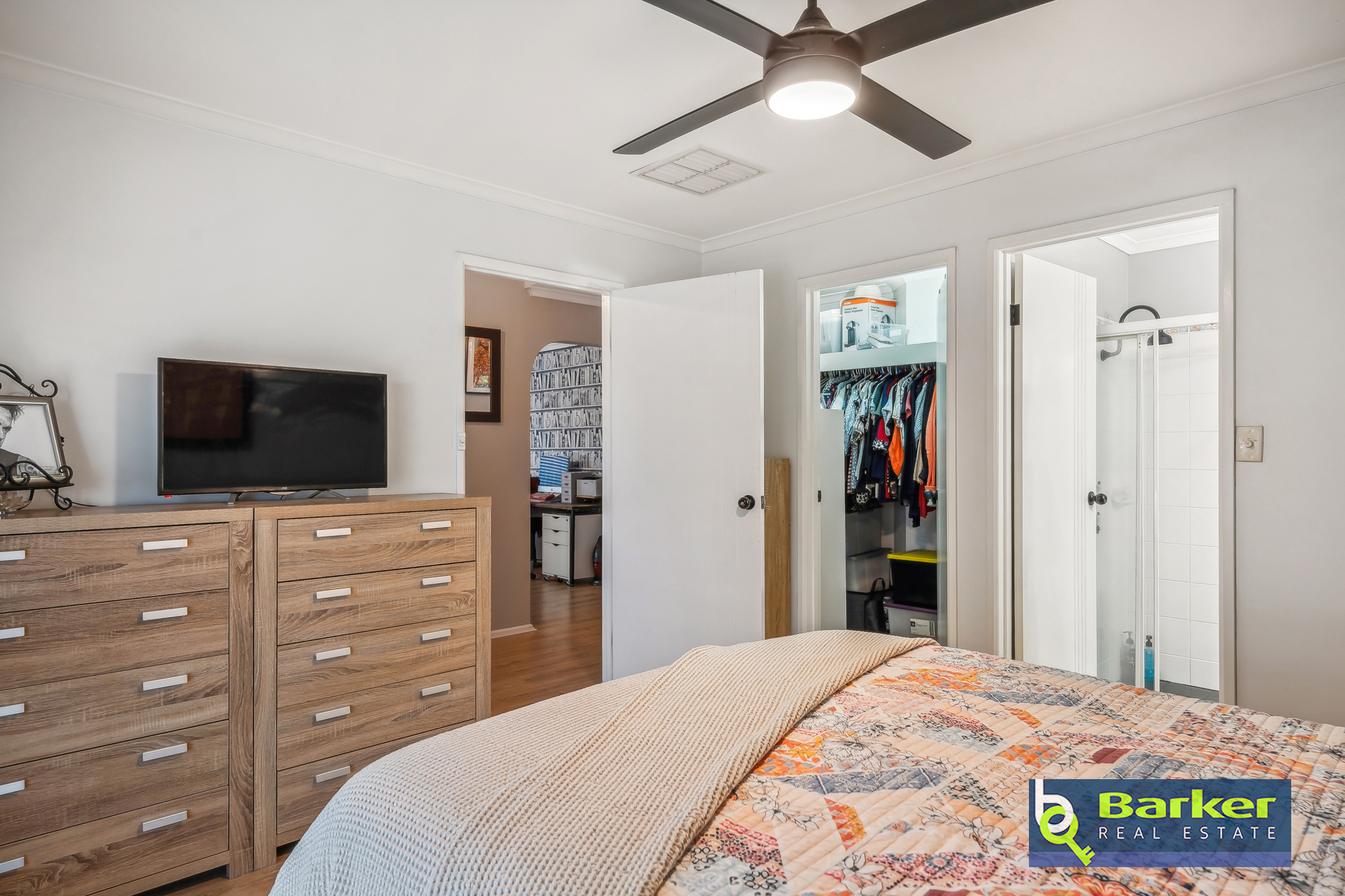 – Master bedroom features floating floors, ceiling fan, ensuite, and walk-in robe.