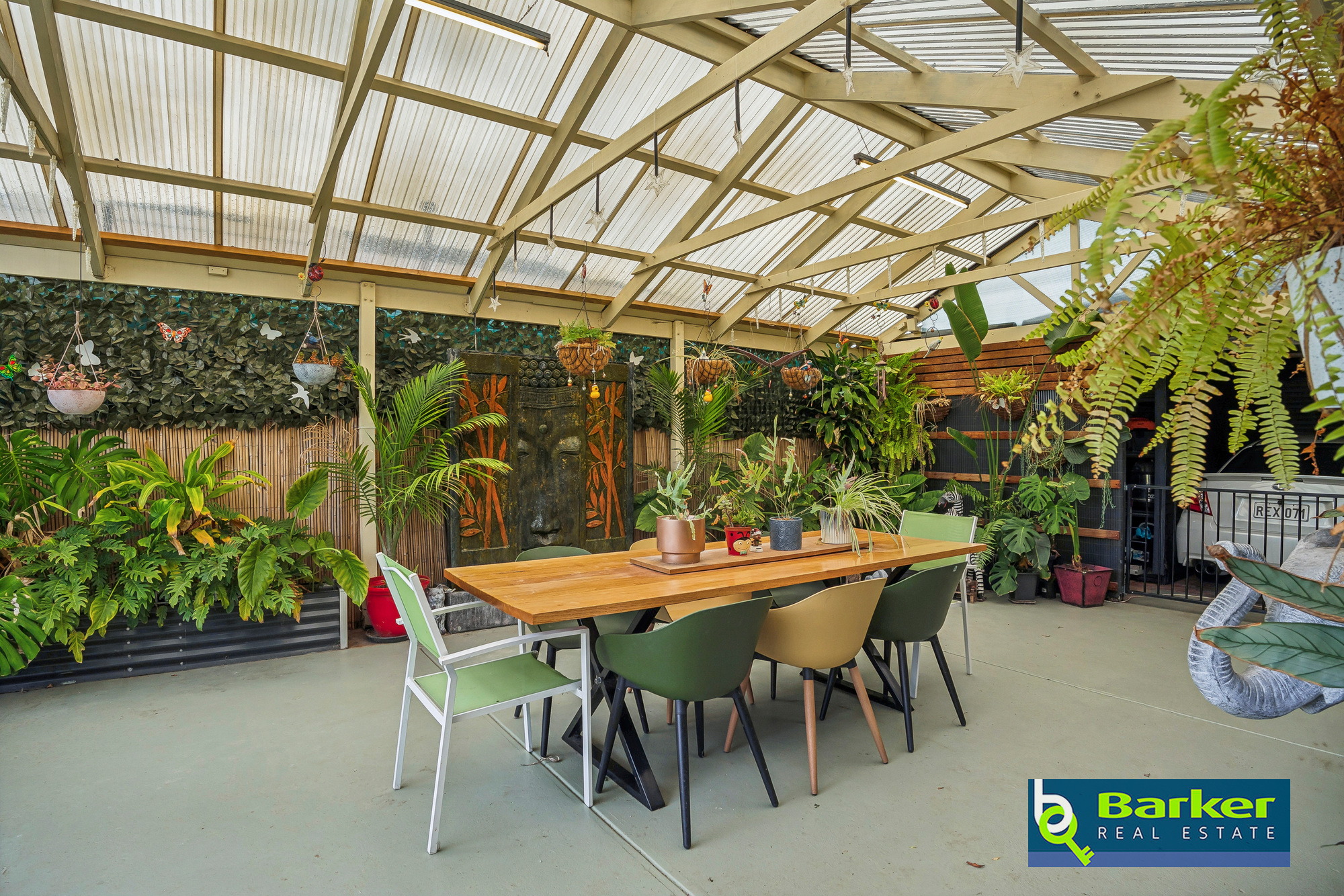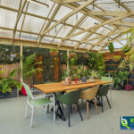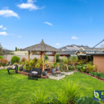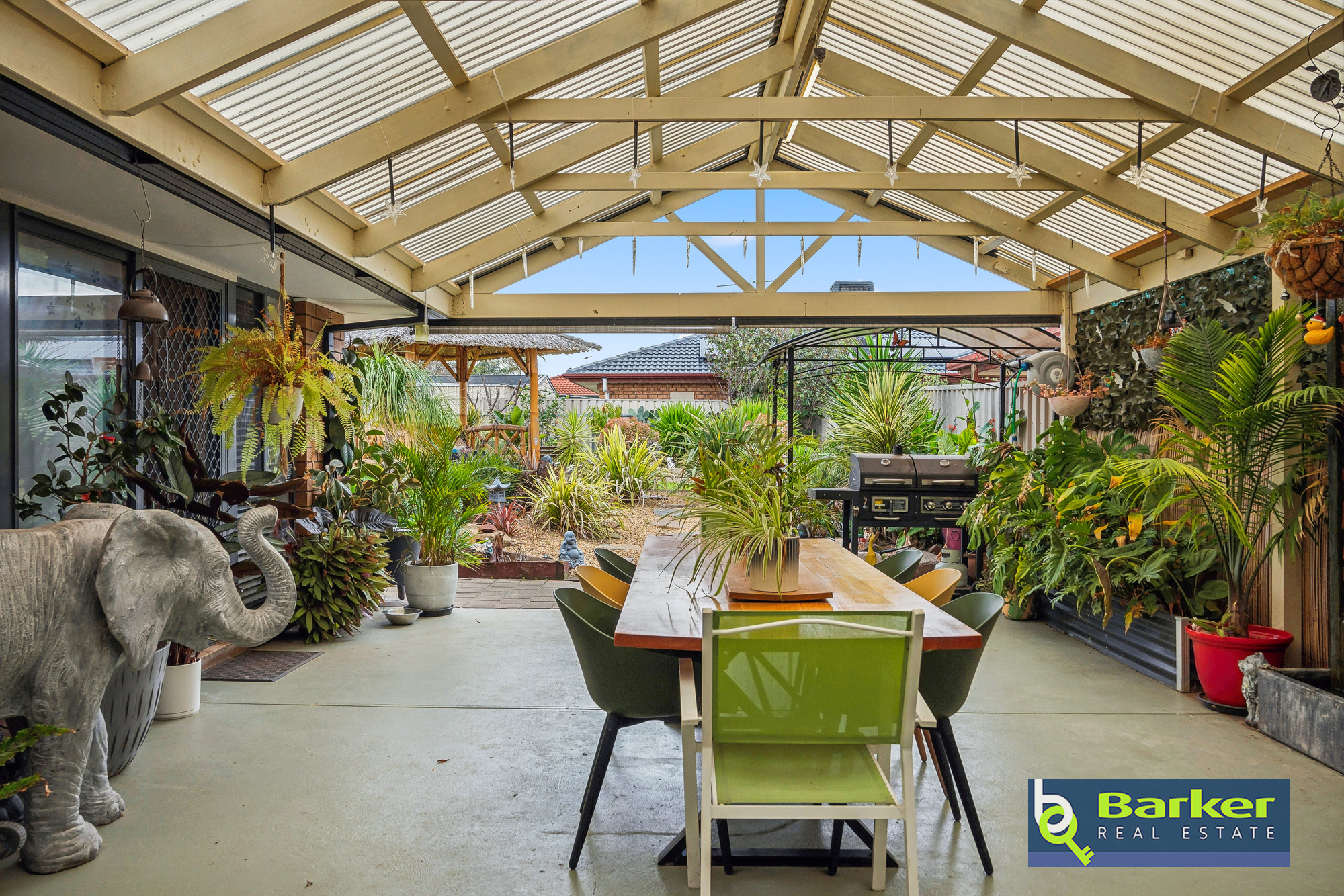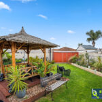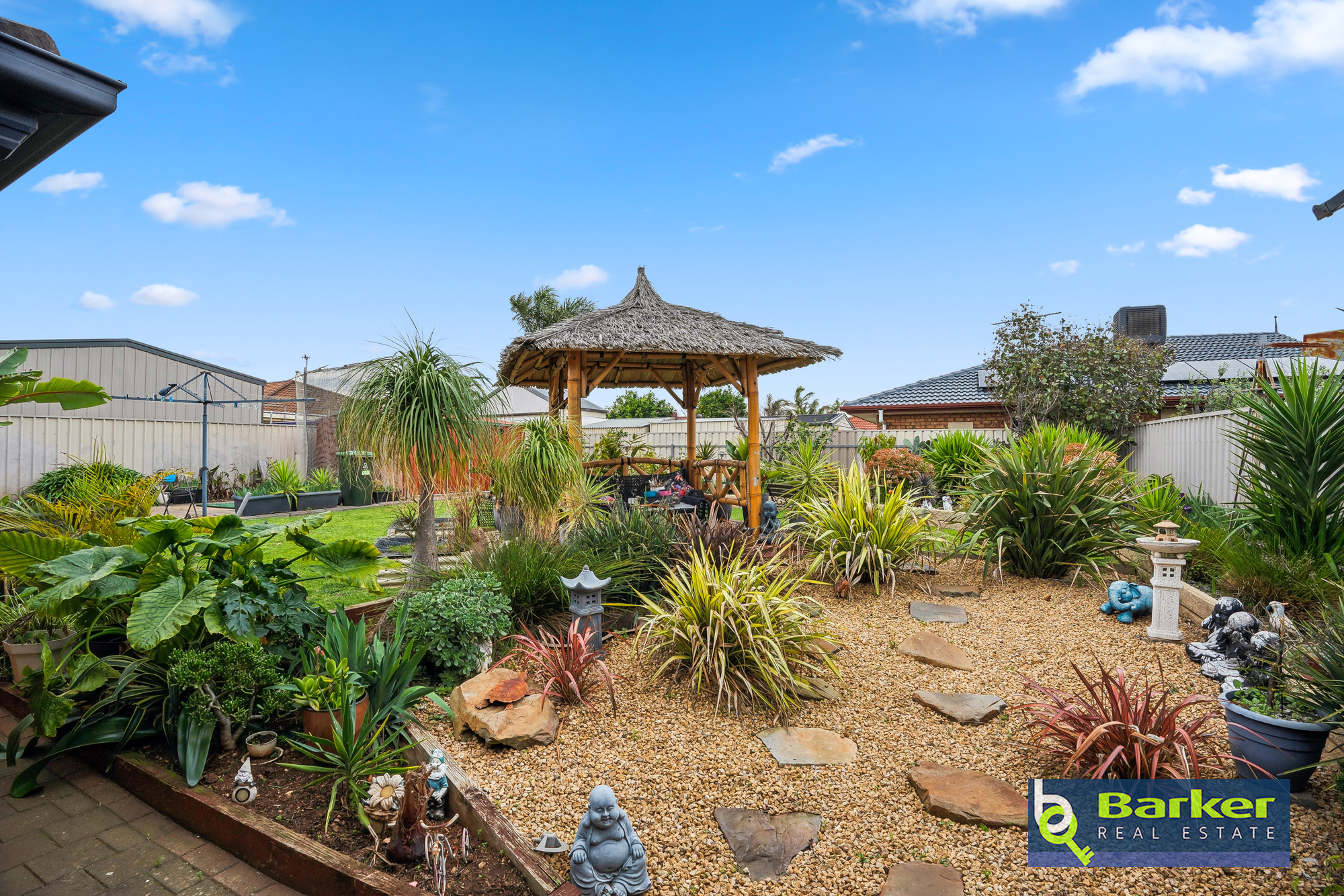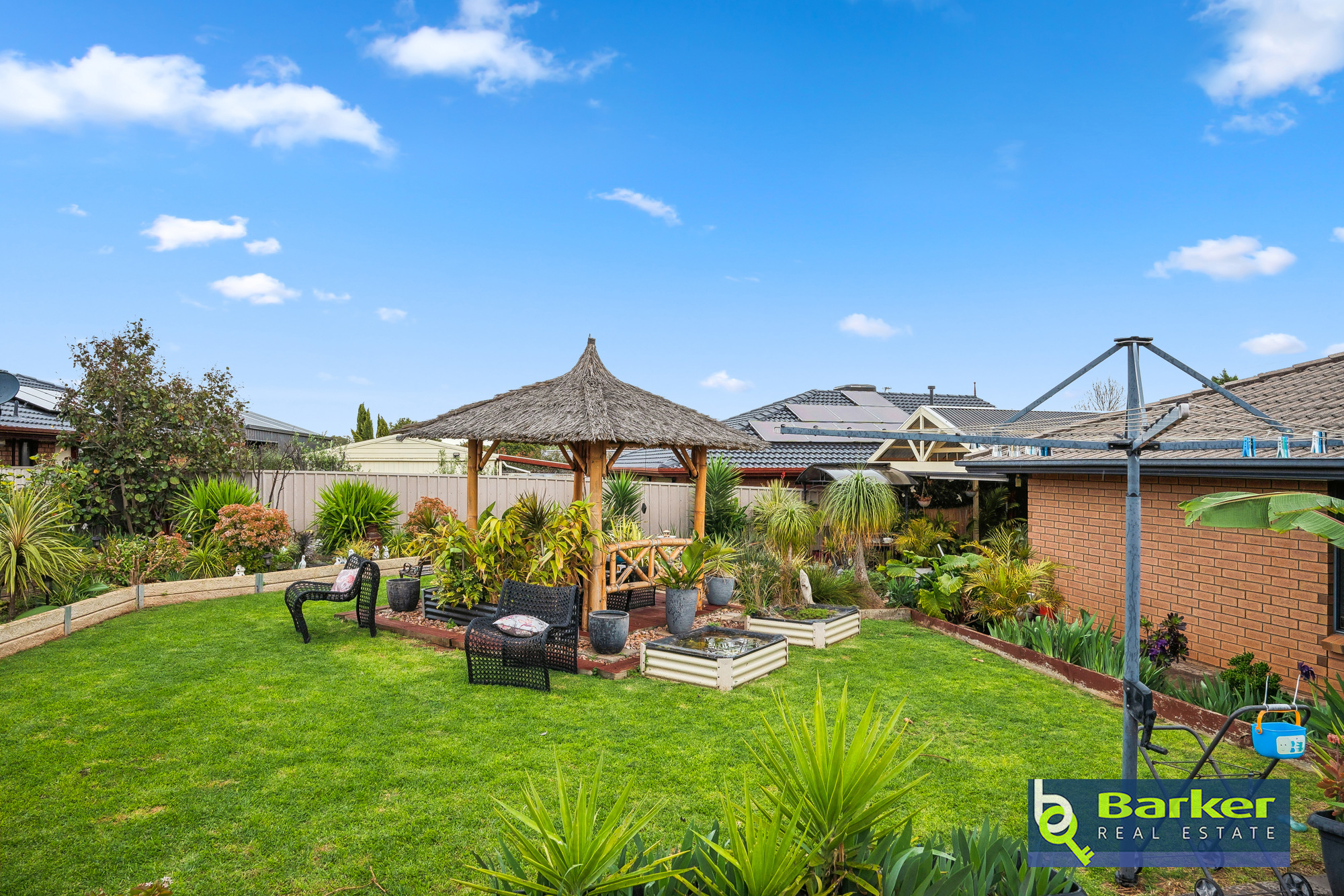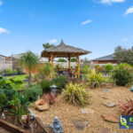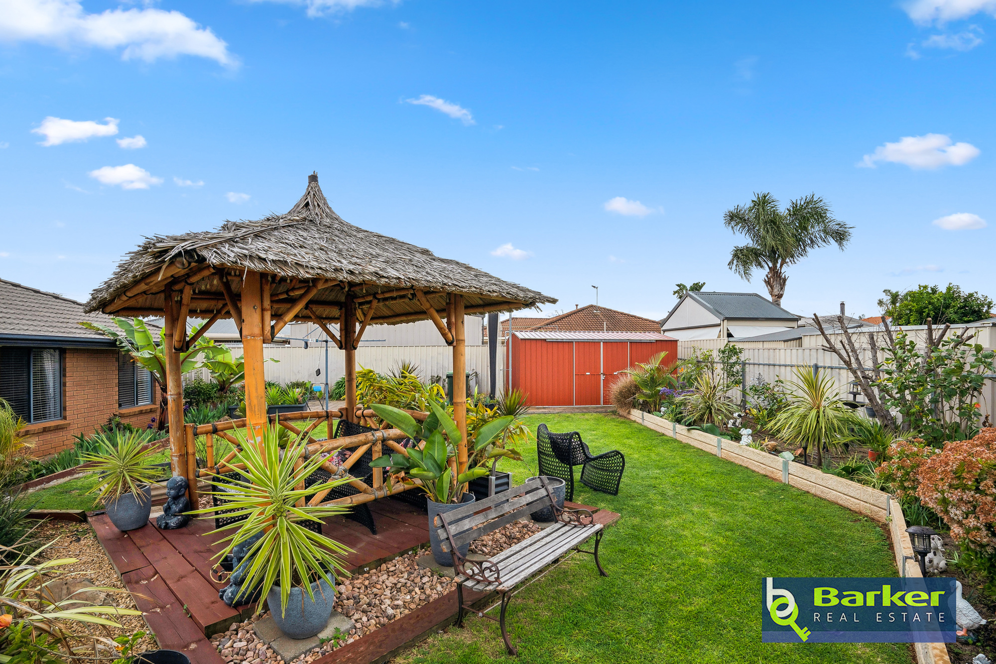 – Bali hut with timber decking overlooking a lawned space at the rear of the yard, and neat garden beds.