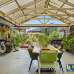 – Large outdoor alfresco area featuring timber gabled verandah and concrete flooring.