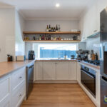 • Modern kitchen with open shelving, gas cooktop, electric oven, double sink, dishwasher and walk in pantry