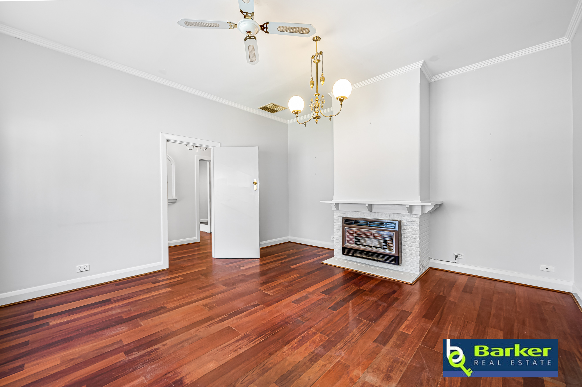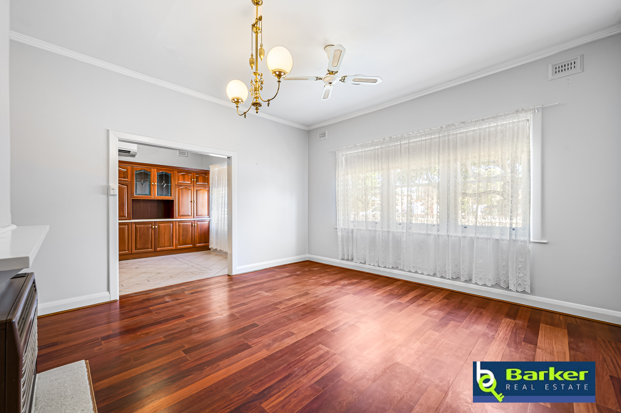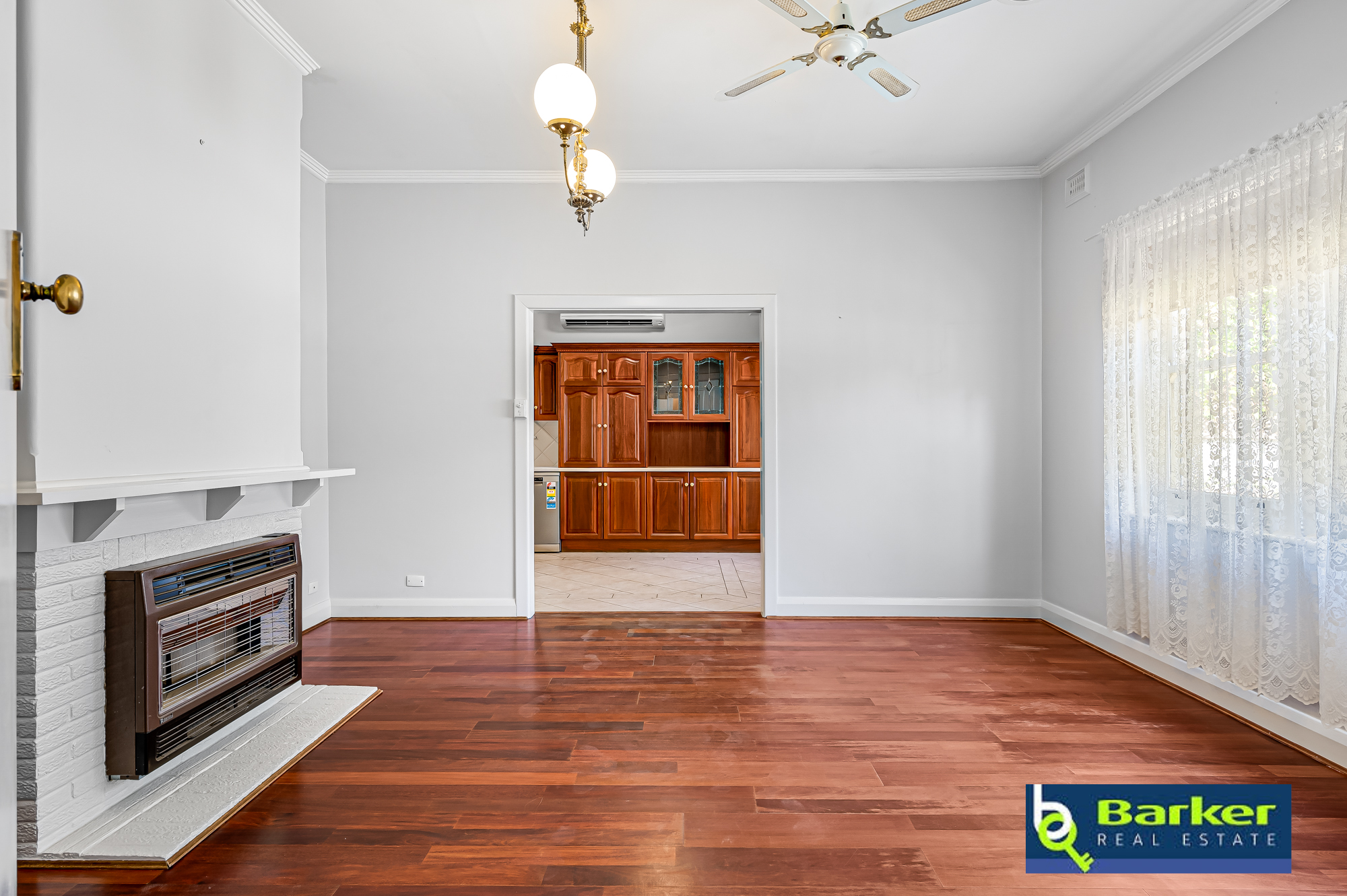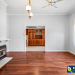 – Formal lounge with wooden floors, celling fan, pendant lighting and gas fire built-in to the mantlepiece making it a focal point of this large room.