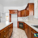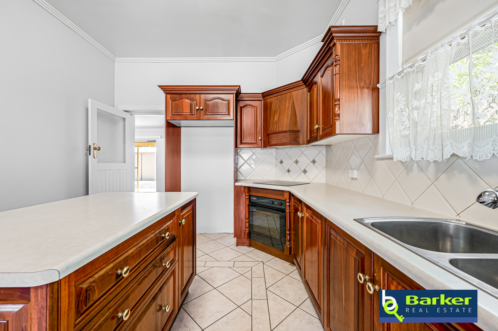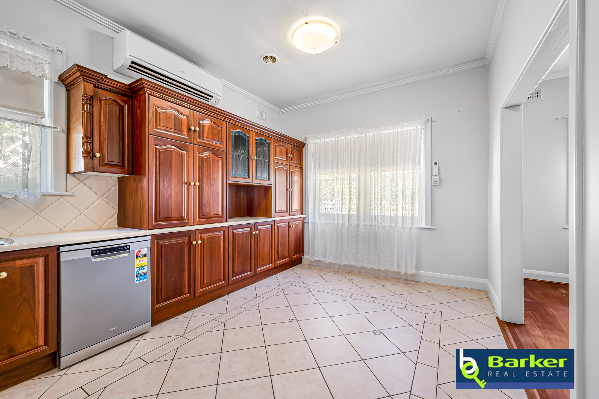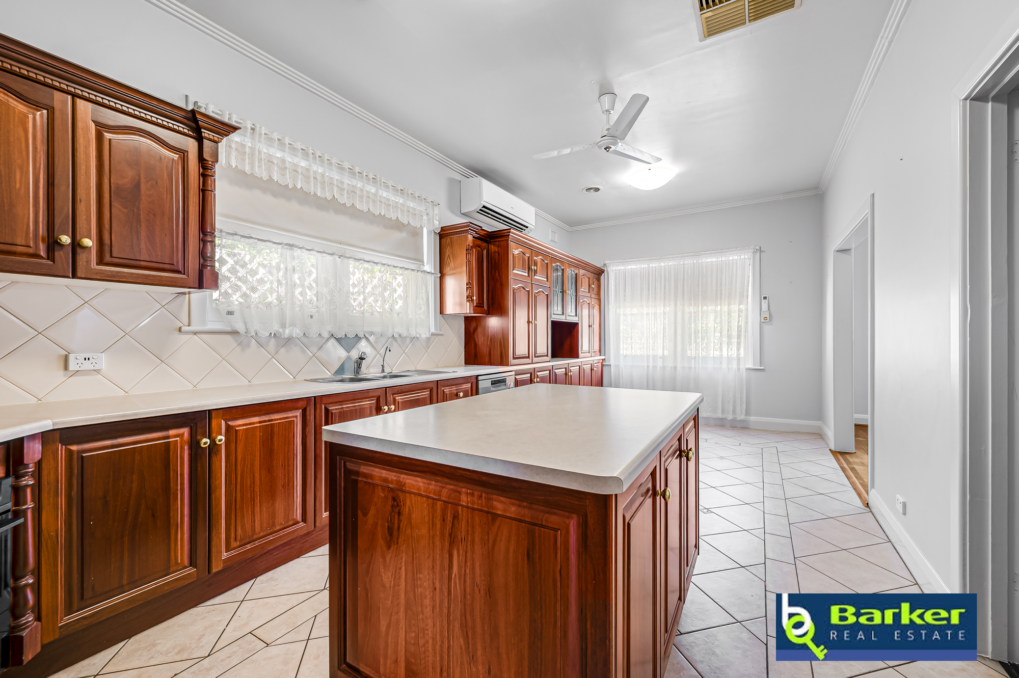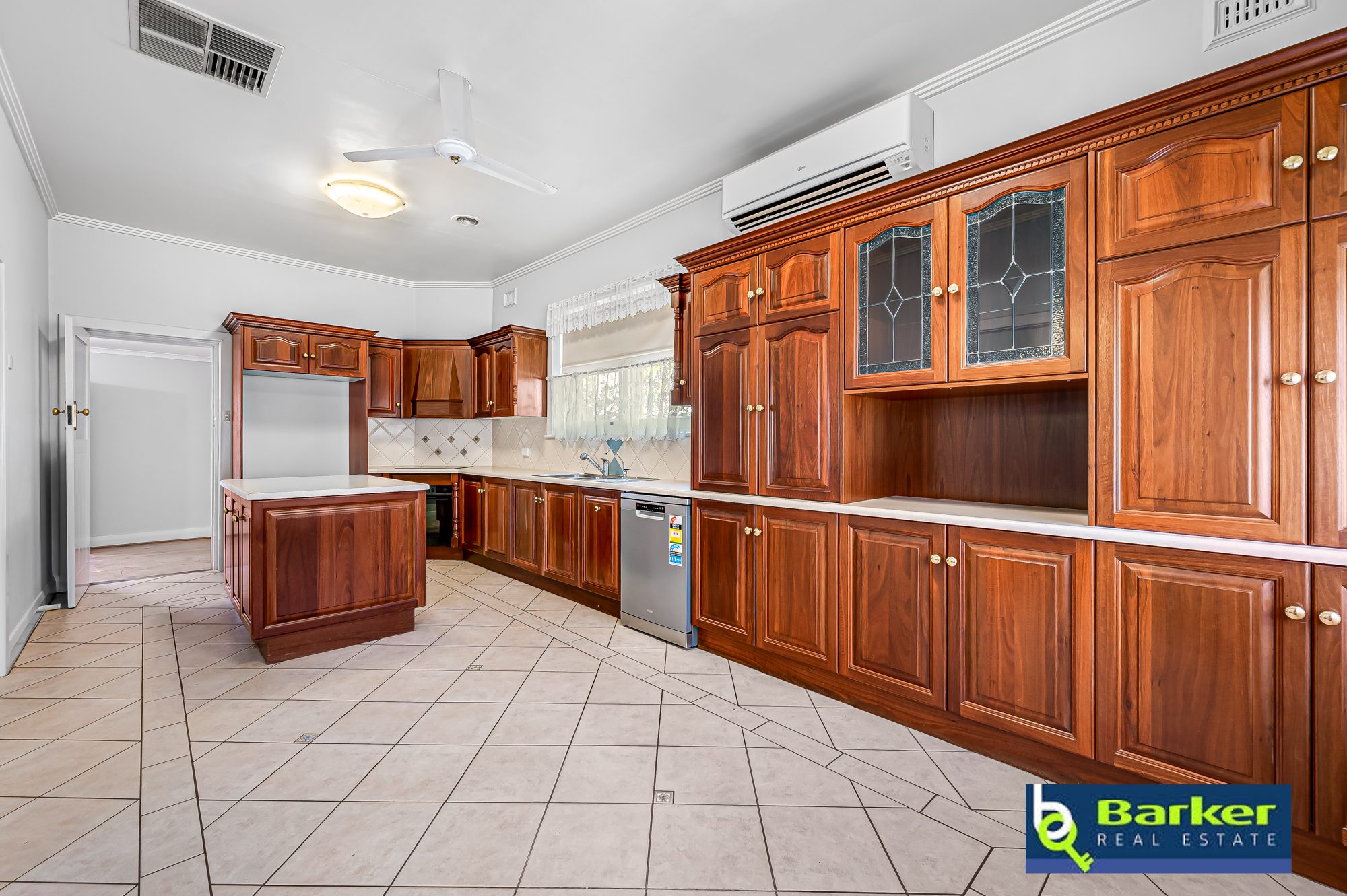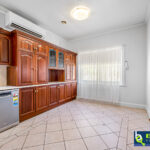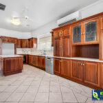 – Kitchen is vast in size and provides a variety of assets with dark timber cabinets, tiled floor, tiled splashback, island bench, large pantry, new dishwasher, double sink, electric induction cooktop, selfcleaning electric oven, ceiling fan and split system.