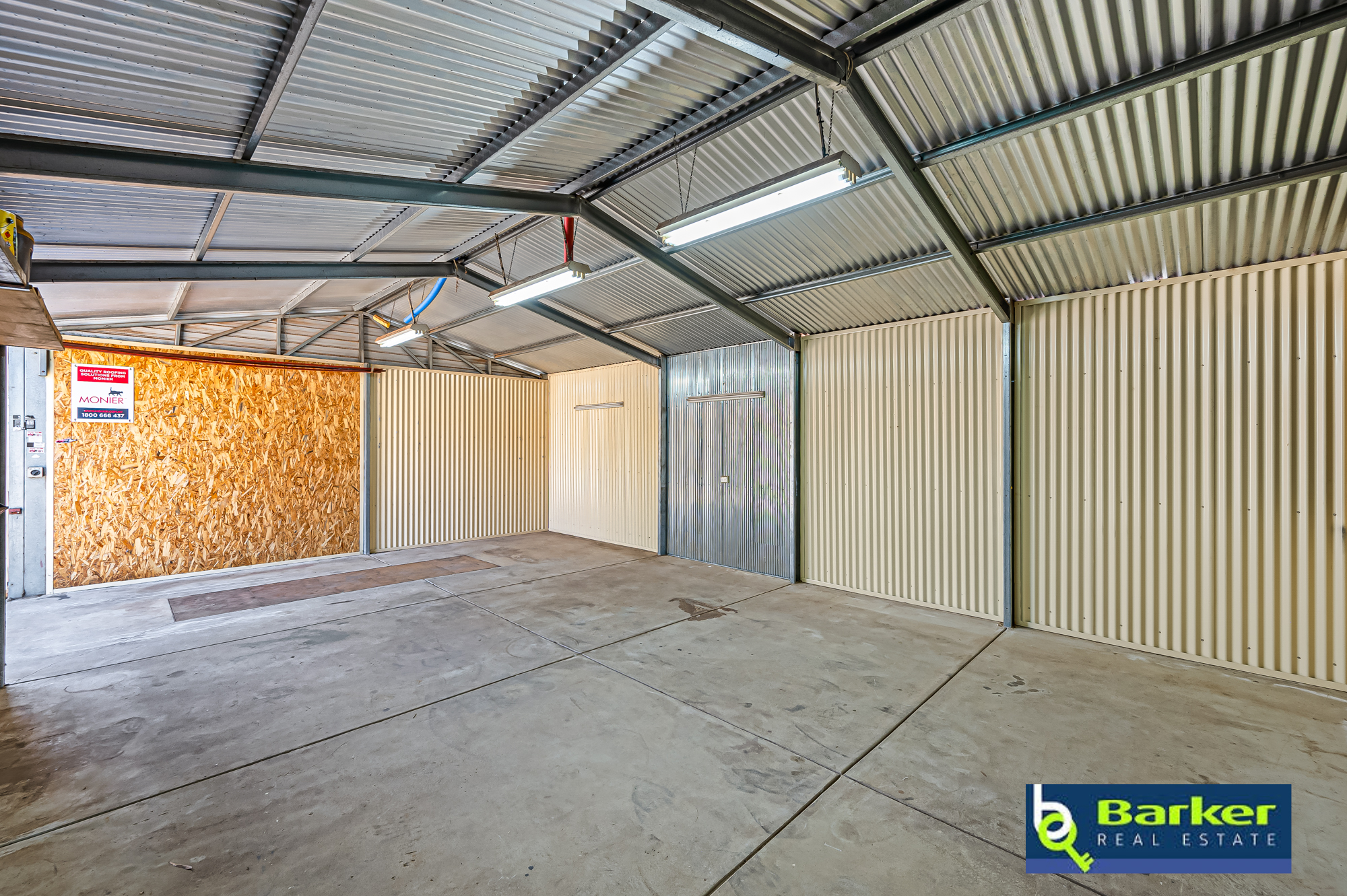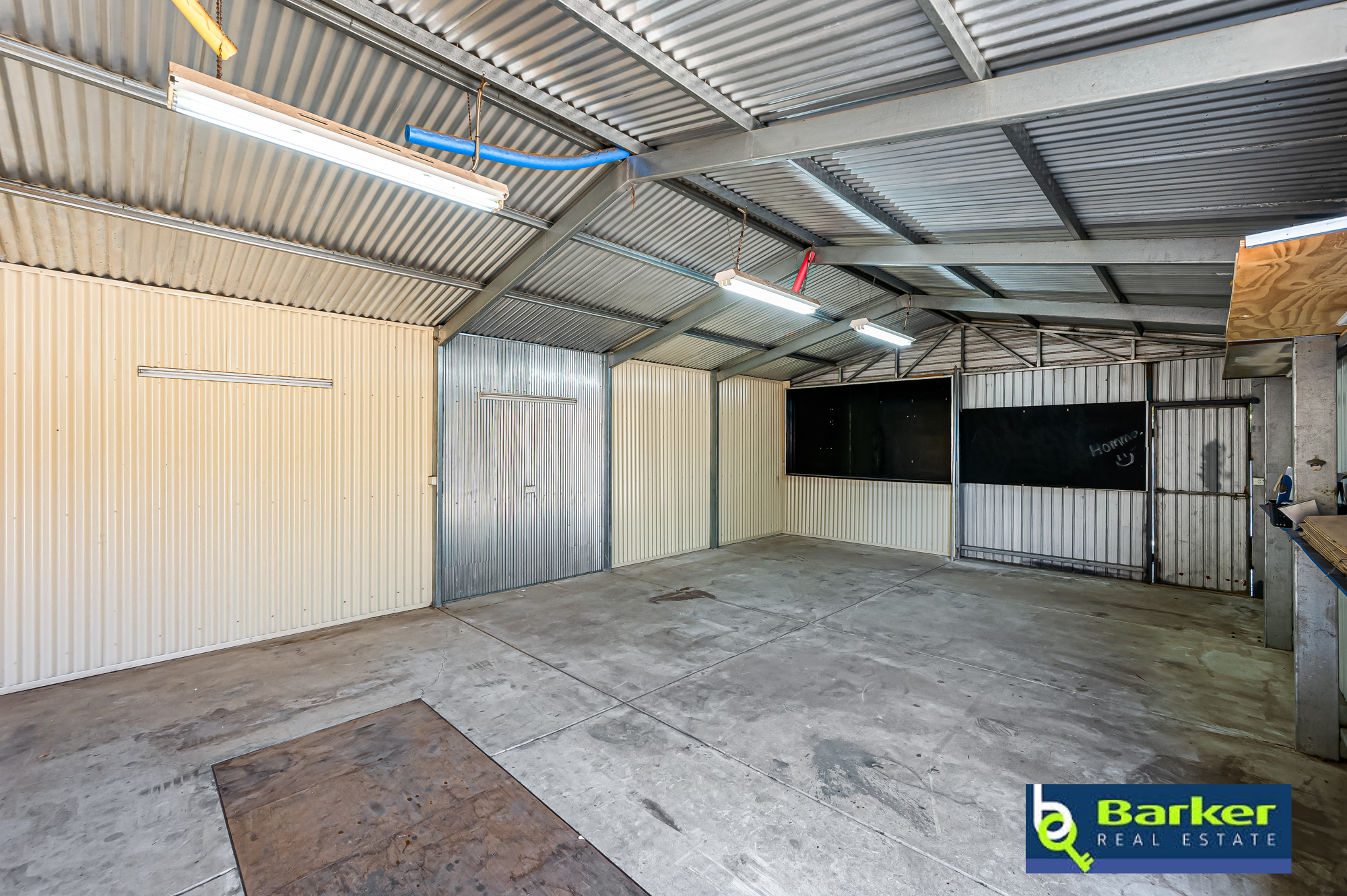 – Shed is 9x6m and has sliding doors, hinged side door access, pit (filled with dirt), benches, concrete & power.