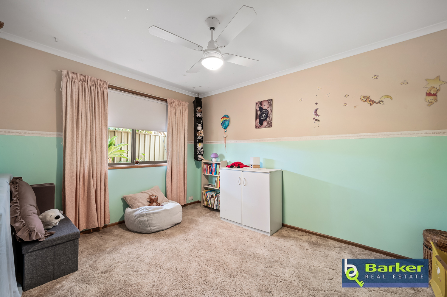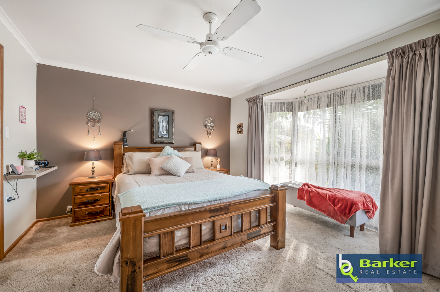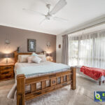 – Master bedroom featuring bay window, walk in wardrobe, ceiling fan & roller shutters.